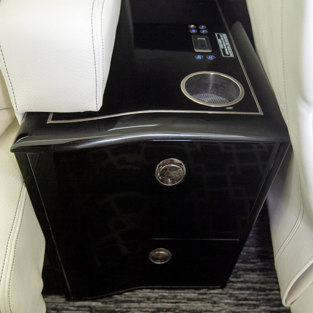 Two reclining, swiveling chairs with fold out executive tables opposite 3-place berthable divan